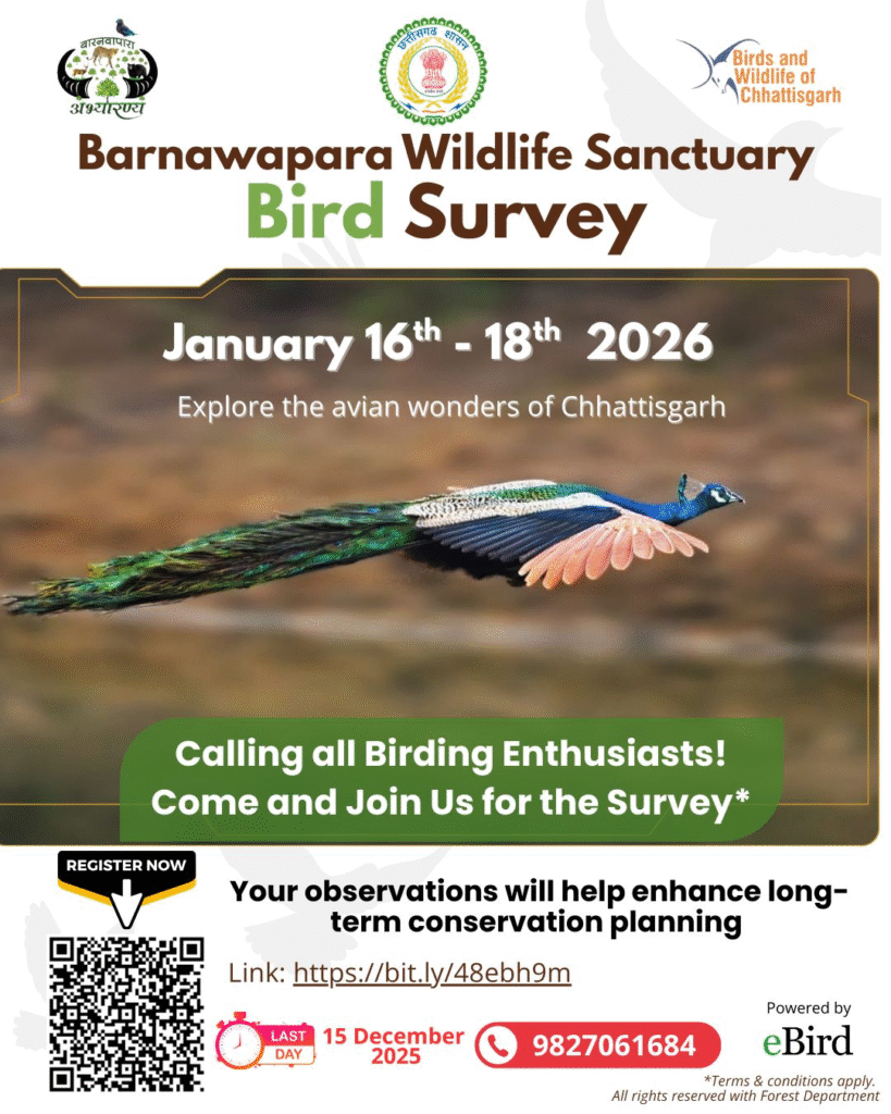 छत्तीसगढ़ की जैव-विविधता के संरक्षण को बढ़ावा देने के उद्देश्य से बारनवापारा वन्यजीव अभयारण्य में ‘सिटिज़न साइंस बर्ड सर्वे’ का आयोजन 16 से 18 जनवरी 2026 तक किया जा रहा है। इस सर्वे में अनुभवी बर्डर्स, शोधकर्ताओं और प्रकृति प्रेमियों को भाग लेने का मौका मिलेगा।